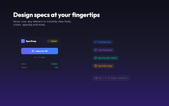 SpecSnap is een gratis Chrome-add-on die gebruikers in staat stelt om de ontwerp specificaties van webpagina-elementen eenvoudig te inspecteren. Met een simpele muisbeweging kunnen gebruikers de lettertype-instellingen, kleuren, afmetingen en spatiëring van elk element op een website bekijken in een overzichtelijk zwevend paneel. Het biedt ook de mogelijkheid om CSS met één klik te kopiëren, wat het werk van ontwerpers en ontwikkelaars aanzienlijk vergemakkelijkt.